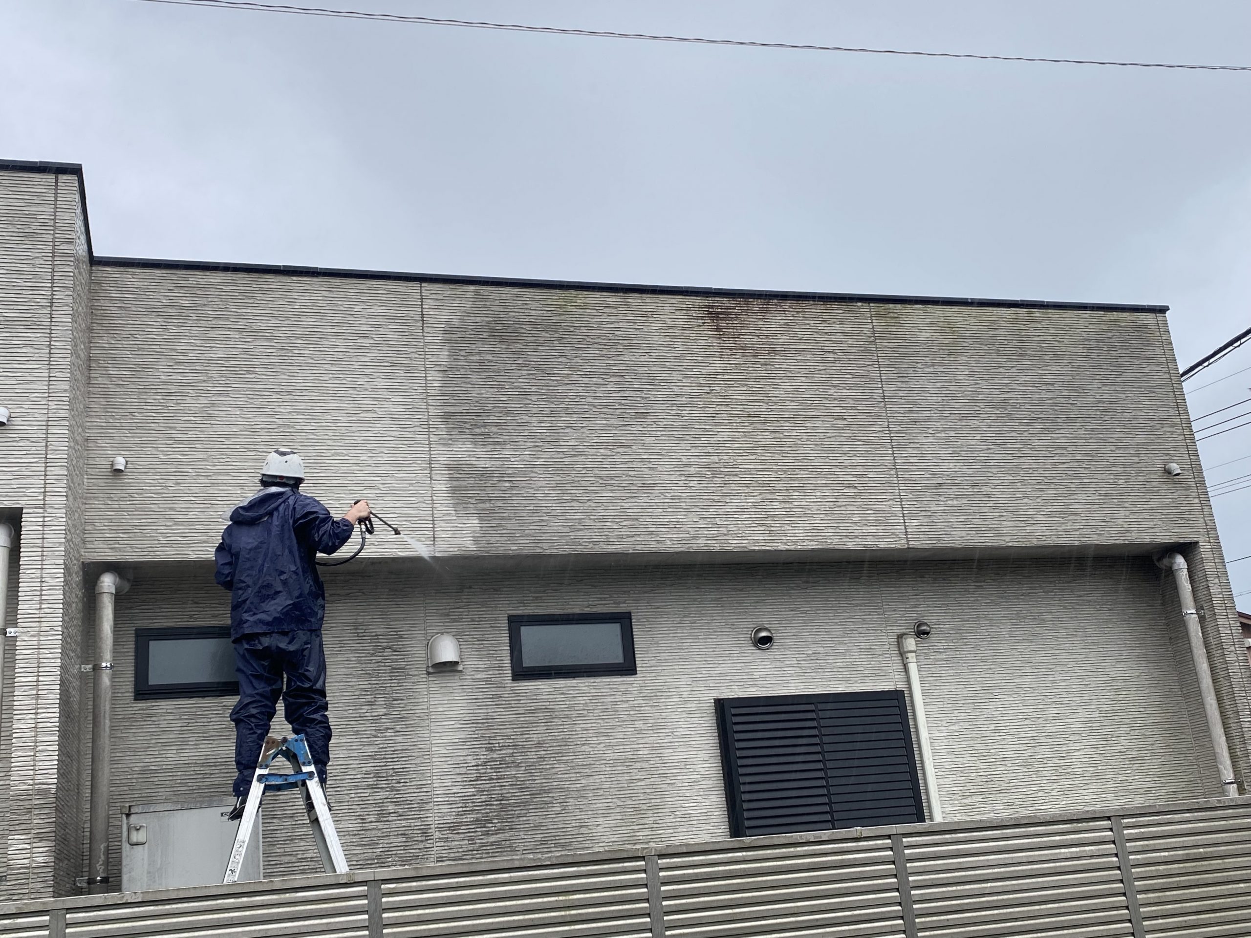 既存の外壁ボードを傷めないように圧をギリギリまで落として高圧洗浄をおこないます